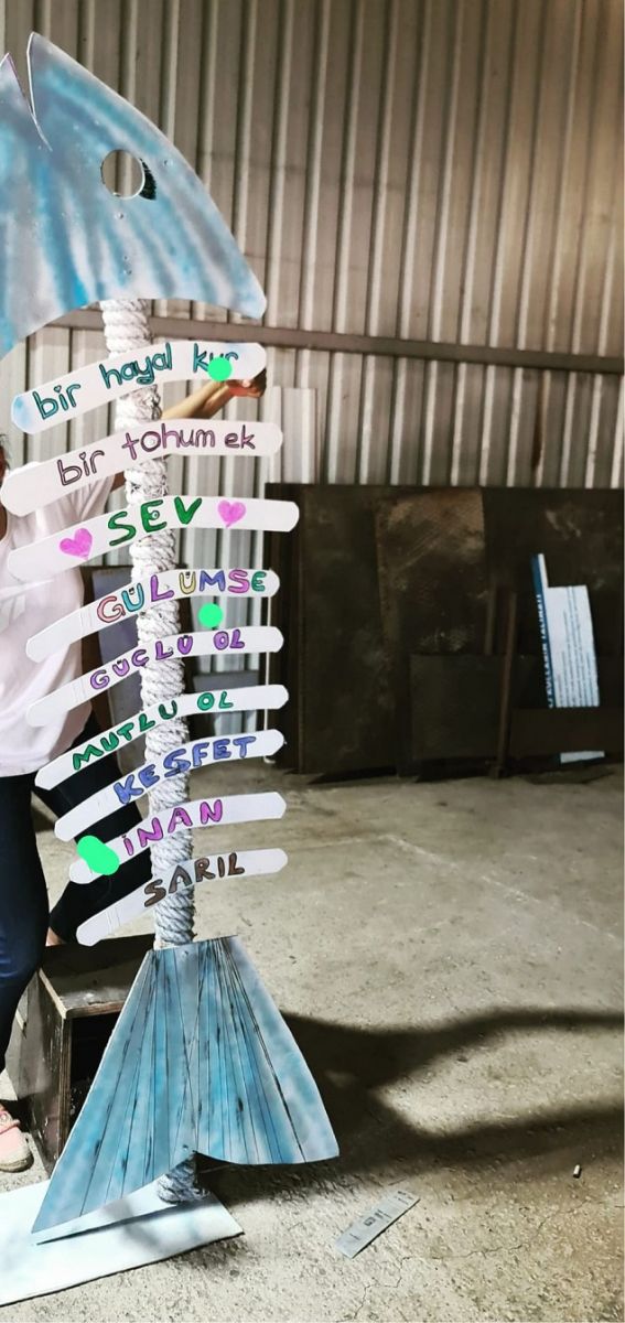 Sahillerdeki temizlik etkinliklerinde elde edilen kapaklarla ‘mavi bayrak’ temalı pano oluşturulurken, plastik şişelerden gemi maketi yapılarak çevre kirliliğine dikkat çekildi. Çevreye gelişigüzel atılan ve denizlerden çıkartılan lastikler ise ekipler tarafından atölyede temizlenip boyandıktan sonra balık figürü olarak tasarlanıp duvarları süsledi.