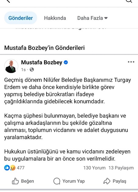 "Geçmiş dönem Nilüfer Belediye Başkanımız Turgay Erdem ve daha önce kendisiyle birlikte görev yapmış belediye bürokratları ifadeye çağrıldıklarında gidebilecek konumdadır.