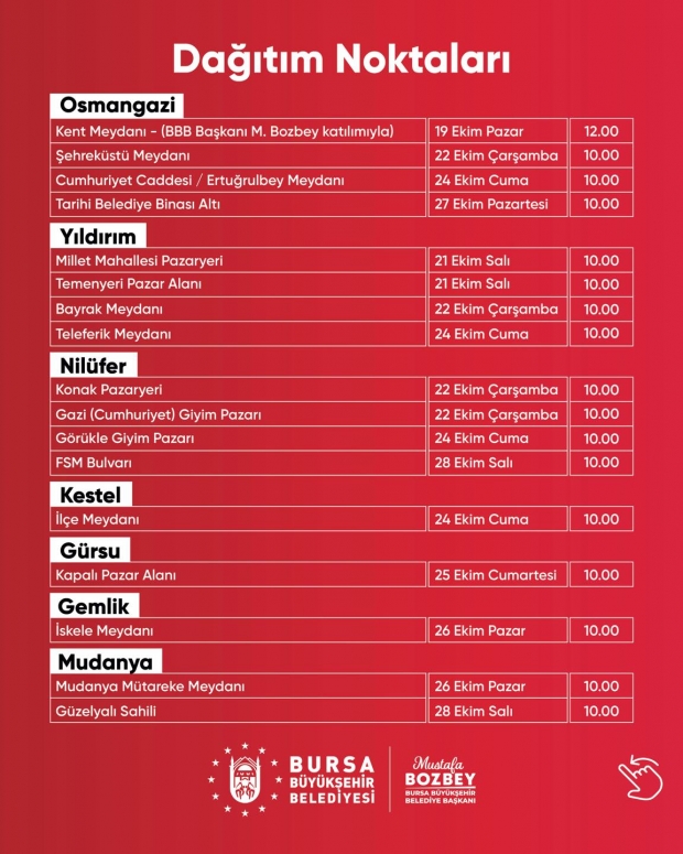 Yağmura rağmen poster dağıtım etkinliğine yoğun ilgi gösteren vatandaşlarla sohbet eden Başkan Mustafa Bozbey, Cumhuriyet’in en büyük ortak değer olduğunu vurgulayarak, “17 ilçemizde 60 bin civarında Ata posteri dağıtıyoruz. Vatandaşlarımız iş yerlerini ve evlerini bu bayraklarla donacaktır. Cumhuriyet coşkusunun her yerde hissedilmesini sağlamalıyız. Cumhuriyet, bizlere Ulu Önder Mustafa Kemal Atatürk’ün en büyük armağanıdır. Bu armağana sahip çıkmak, onun ilke ve devrimlerini yaşatmak hepimizin en temel sorumluluğudur. Cumhuriyet Bayramı’nı coşkuyla kutlamak, aynı zamanda birlik, beraberlik ve umut duygularımızı tazelemektir. Bursa, her zaman olduğu gibi bu yıl da Cumhuriyetine sahip çıkıyor. Şimdiden Cumhuriyet Bayramımızı kutluyorum” dedi.