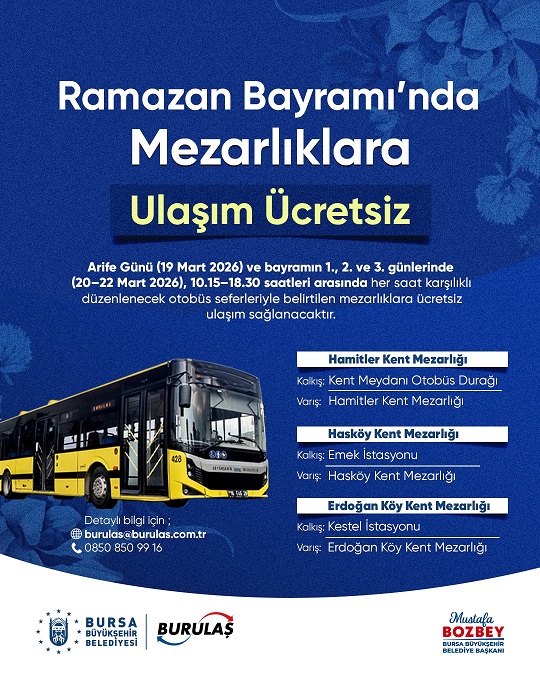 Ayrıca Arife günü ile bayram boyunca 10.15-18.30 saatleri arasında her saat karşılıklı düzenlenecek otobüs seferleriyle mezarlıklara da ücretsiz ulaşım sağlanacak. Hamitler Kent Mezarlığı’na otobüsler Kent Meydanı otobüs durağından, Hasköy Kent Mezarlığı’na Emek İstasyonu’ndan, Erdoğan Köy Kent Mezarlığı’na ise Kestel İstasyonu’ndan kalkacak.