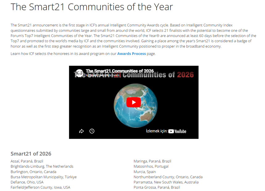 ICF, Smart21 listesinde yer alan kentlerin daha detaylı değerlendirmesini yaparak en başarılı 7 şehri finalist olarak belirleyecek. Bu kentler, Hollanda’da gerçekleşecek konferansta duyurulacak. Daha sonra ABD’de yapılacak küresel zirveyle de ‘Intelligent Community of the Year 2026’ (Yılın En Akıllı Şehri) ödülü verilecek.