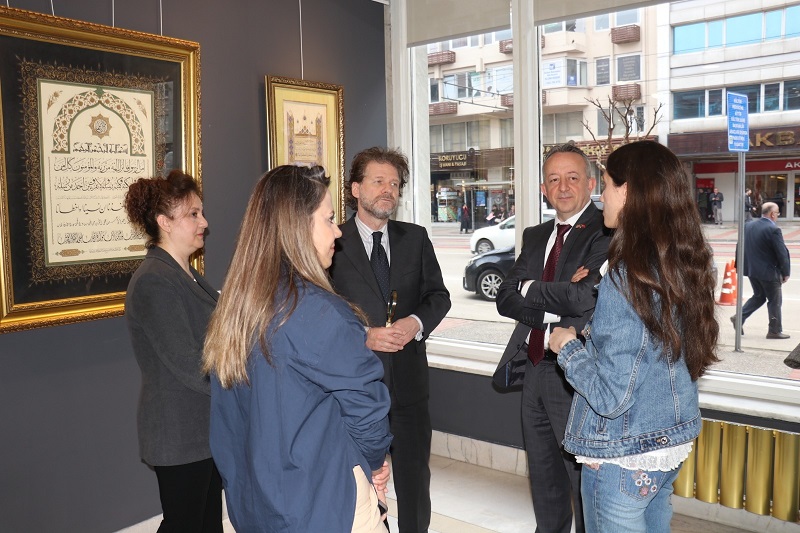Bursa programını kültürel ziyaretle sürdüren Büyükelçi Manasijevski, Tayyare Kültür Merkezi’nde düzenlenen ‘Zer-i Nab’ tezhip sergisini de gezdi. Bursa Büyükşehir Belediyesi’nin katkılarıyla gerçekleştirilen sergi hakkında sanatçı Özgür Sema, heyete tezhip sanatının tarihsel gelişimi, estetik yönü ve teknik detayları hakkında bilgi verdi.