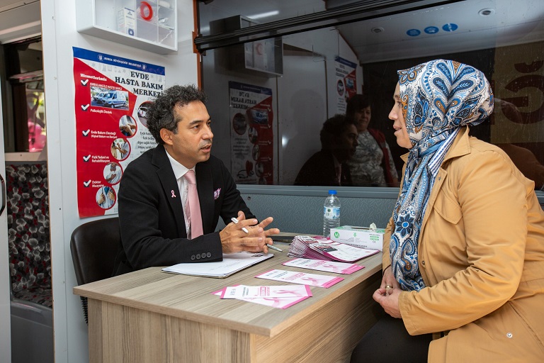Bursa Büyükşehir Belediyesi, 1-31 Ekim Meme Kanseri Farkındalık Ayı’nda çeşitli etkinliklerle halk sağlığına dikkat çekmeye devam ediyor. Sağlık İşleri Dairesi Başkanlığı Halk Sağlığı ve Sağlıklı Yaşam Şube Müdürlüğü tarafından Orhangazi Parkı’nda düzenlenen programda, İstanbul Tıp Fakültesi’nden Genel Cerrahi ve Meme Cerrahisi Uzmanı Doç. Dr. Selman Emiroğlu tarafından Sağlık Otobüsü içerisinde kadınlara ücretsiz muayene yapıldı. Alanda ücretsiz şeker ve tansiyon ölçümleri de yapan Büyükşehir Belediyesi hekimleri, vatandaşlara erken teşhis konusunda bilgilendirme broşürleri dağıttı.