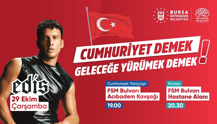 Cumhuriyet’in 102. yıl dönümünün kutlanacağı 29 Ekim Çarşamba günü ise Kapanca-Tirilye rotasındaki doğa yürüyüşünden FSM Bulvarı-Acıbadem Kavşağı arasındaki Cumhuriyet yürüyüşüne, Kaplıkaya Huzurevi’ndeki Cumhuriyet etkinliklerinden Atatürk Caddesi UNESCO Meydanı’ndaki ‘Atatürk ve Cumhuriyet’ temalı dev puzzle çalışmasına, canlı müzik performanslarından ödül törenlerine kadar birçok etkinlikle Cumhuriyet Bayramı’nın heyecanı gün boyunca tüm ilçelere taşınacak. Sabah saatlerinde Heykel Atatürk Anıtı önünde yapılacak olan resmi kutlama programının ardından saat 19.00’da on binlerce Cumhuriyet sevdalısının katılımıyla Fatih Sultan Mehmet Bulvarı’nda ‘Cumhuriyet Yürüyüşü’ gerçekleştirilecek. Saat 20.00’de Nilüfer Hastane Alanı'ndaki Edis konseriyle de coşku doruğa çıkacak. 30 Ekim Perşembe günü Tayyare Kültür Merkezi’nde okullara yönelik yapılacak ‘Mustafa’ adlı film gösterimiyle etkinlikler sona erecek.
