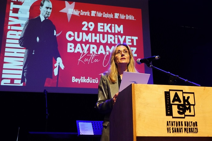 Beylikdüzü’nün seçilmiş Belediye Başkanı Mehmet Murat Çalık’ın eşi Zehra Çalık programda yaptığı konuşmada,“ Bugün, Cumhuriyetimiz 102 Yaşında ve yüreğim tarifsiz bir duygu içinde. Bir yanımda, Gazi Mustafa Kemal Atatürk ve silah arkadaşlarının bize armağan ettiği bu büyük bayramın coşkusu gururu, diğer yanımda ise, bu kutlamayı ve coşkuyu ailesinden, sevdiklerinden, sizlerden 500 kilometre uzakta, tutuklu olarak karşılamak zorunda kalan eşim, Belediye Başkanımız Mehmet Murat Çalık'ın yokluğunun burukluğu var. Ama biliyorum ki, Mehmet’in yüreği şu an burada, sizlerle, çok sevdiği Beylikdüzü ile. Onun hiçbir zaman makamlarla, mevkilerle, unvanlarla derdi olmadı. Onun tek derdi Gazi Mustafa Kemal Atatürk'ün kurduğu, bağımsız, özgür, güçlü Türkiye Cumhuriyeti'nde çocukların, gençlerin, kadınların yaş almış büyüklerimizin yüzünün gülmesiydi. Mehmet, en zor anlarında bile inancını, vatan sevgisini ve sizlere olan, bu memlekete olan güvenini asla yitirmedi. "Bu millet, bu ülke, her zorluğun üstesinden gelmeyi bilir." derdi. Onun bu inancı, bugün benim ve çocuklarımızın en büyük dayanağı. Ve biz, bu inancı sizlerle paylaşıyoruz. Ben inanıyorum ki ülkece bu süreçten daha da güçlenerek çıkacağız. Zorluklar, bizleri yıpratmak için değil, kenetlenip daha da güçlenmemiz için bir fırsattır. Bugün burada, bu coşku ve kararlılık içinde, bu inancın bir kez daha filizlendiğini görüyorum. Sağ olun, var olun” ifadelerini kullandı.