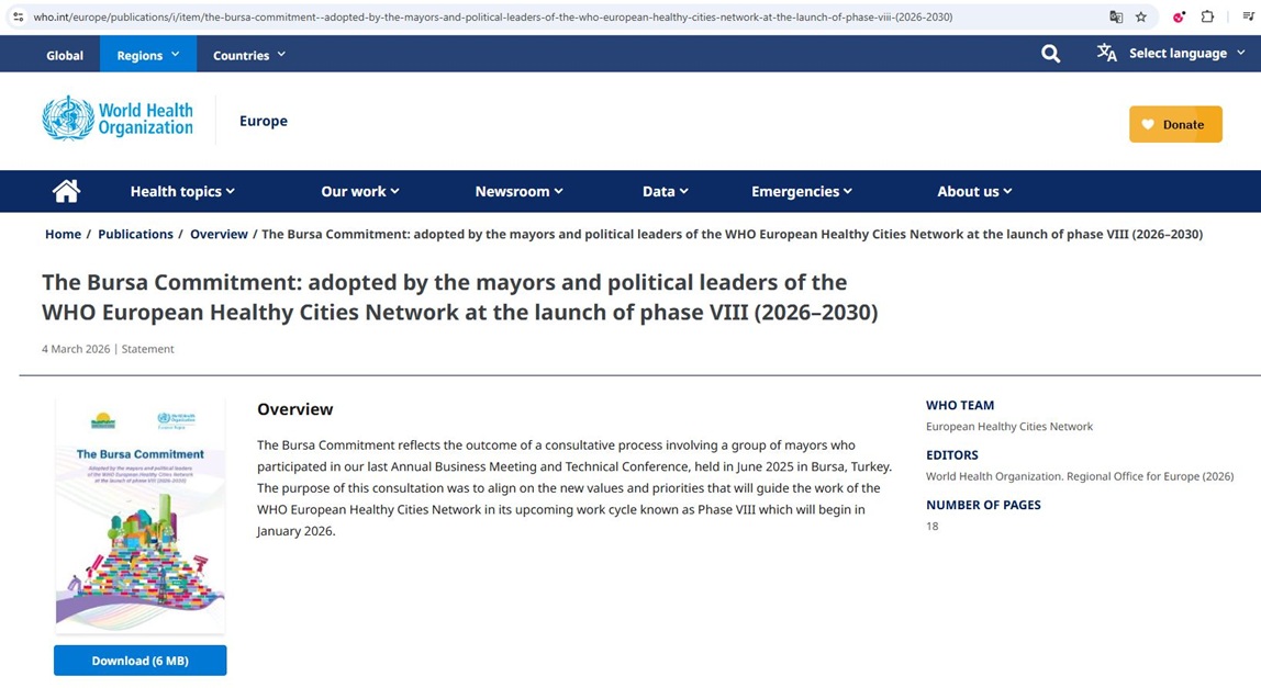 Bursa Taahhüdü, Dünya Sağlık Örgütü’nün resmi internet sitesinde yayımlanarak küresel kamuoyuyla paylaşıldı. Böylece sağlıklı şehirler vizyonu doğrultusunda yerel yönetimlere yönelik önemli bir referans belgesi niteliği kazandı.