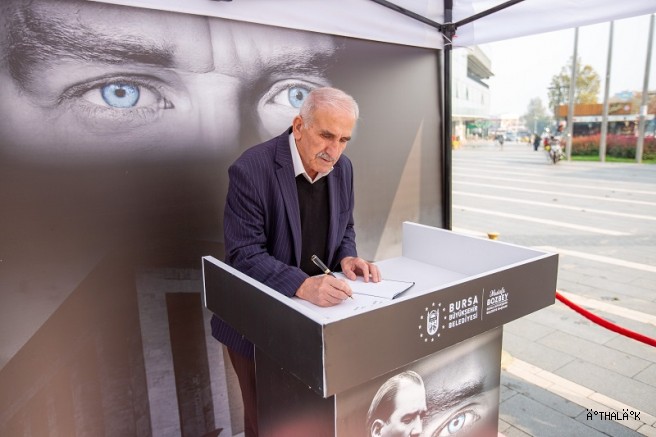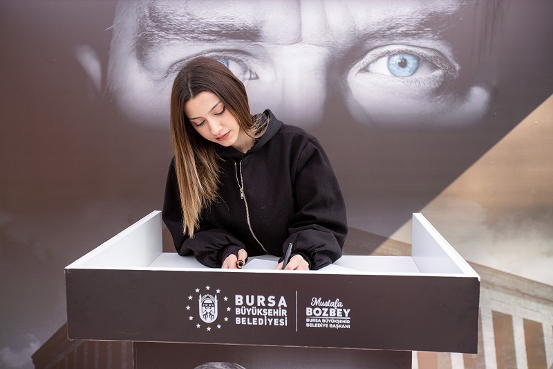 Bursa Büyükşehir Belediyesi, Cumhuriyet’in kurucusu, Ulu Önder Gazi Mustafa Kemal Atatürk’ün ebediyete uğurlanışının 87. yıl dönümü dolayısıyla kent genelinde anlamlı bir etkinliğe daha imza attı. Bursalıların Atatürk’e olan sevgi, saygı ve özlemlerini ifade edebilmeleri amacıyla kentin 10 ayrı noktasına ‘anı defteri stantları’ kuruldu.
