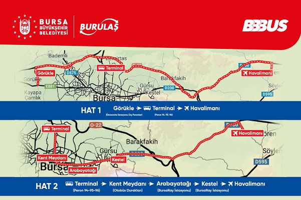 Bursa’da toplu taşımayı özendirmek amacıyla gece seferlerinden ‘gittiğin kadar öde’ uygulamasına ve yapay zeka çalışmalarına kadar çok sayıda yeniliği kente kazandıran Büyükşehir Belediyesi, ulaşımı daha kolay ve konforlu hale getirmek için yeni bir hizmeti daha devreye alıyor. Her gün toplu taşıma araçlarında yüz binlerce vatandaşı taşıyan Büyükşehir Belediyesi iştiraklerinden BURULAŞ, Yenişehir Havalimanı'na 12 Haziran Perşembe gününden itibaren BBBUS otobüs seferlerini başlattı. Yeni sefer hatları, Görükle-Terminal-Yenişehir Havalimanı ile Terminal-Kent Meydanı-Arabayatağı-Kestel-Yenişehir Havalimanı şeklinde olacak. Uygulamada, BursaKart kullanımı geçerli olmayacak. Bilet almak, sefer saatlerini öğrenmek ve detaylı bilgi için https://bus.burulas.com.tr/ adresi ziyaret edilebilir.