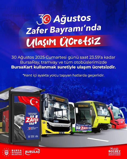 Bursa Büyükşehir Belediyesi tarafından 30 Ağustos Zafer Bayramı kutlama ve etkinliklerinin coşkulu kalabalıklarla yapılabilmesi için BursaRay, Burulaş otobüsleri ve tüm Özel Halk otobüslerinde 30 Ağustos Cumartesi günü saat 23.59’a kadar ulaşımın ücretsiz olacağı belirtildi. Ücretsiz uygulamadan yararlanmak için vatandaşların ulaşım kartlarını kullanmaları gerekirken, uygulama kent içi ayakta yolcu taşıyan hatlarda geçerli olacak.