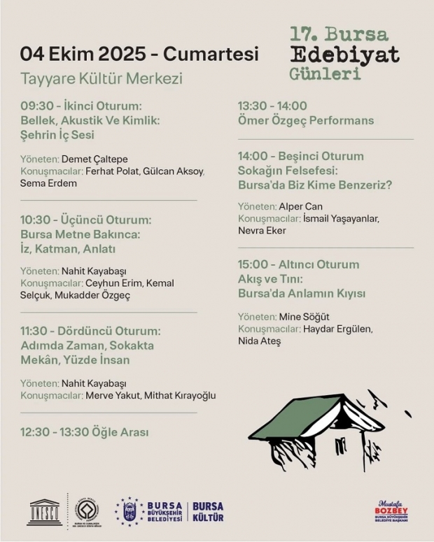 Tayyare Kültür Merkezi’nde devam edecek olan Edebiyat Günleri’nin ikinci gününde de birçok önemli yazarın ve fikir insanının katılımıyla, ‘Bellek, Akustik ve Kimlik: Şehrin İç Sesi’, ‘Bursa Metne Bakınca: İz, Katman, Anlatı’, ‘Adımda Zaman, Sokakta Mekan, Yüzde İnsan’, Sokağın Felsefesi: Bursa’da Biz Kime Benzeriz?’, ‘Akış ve Tını: Bursa’da Anlamın Kıyısı’ konulu oturumlar gerçekleştirilecek.