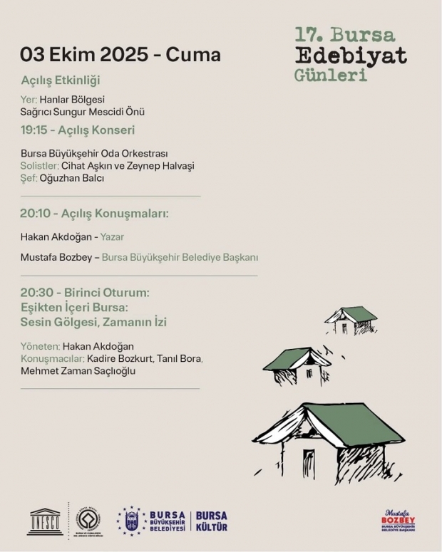 Bursa Edebiyat Günleri, 3 Ekim Cuma Günü saat 19.15’te Hanlar Bölgesi Sağrıcı Sungur Mescidi önünde Büyükşehir Oda Orkestrası’nın vereceği açılış konseri ile başlayacak. Yazar Hakan Akdoğan ve Büyükşehir Belediye Başkanı Mustafa Bozbey’in konuşacağı program, Kadire Bozkurt, Tanıl Bora, Mehmet Zaman Saçlıoğlu’nun konuşmacı olduğu ‘Eşikten İçeri Bursa: Sesin Gölgesi, Zamanın İzi’ adlı oturumla devam edecek.