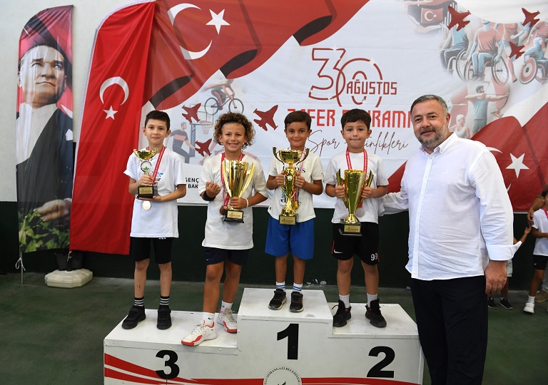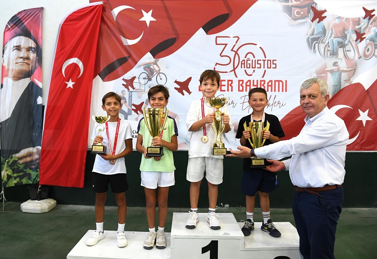 30 Ağustos Zafer Bayramı’na özel Ertuğrul Sağlam Spor Tesisleri’nde 8 yaş gurubundaki çocuklar için düzenlenen turnuvaya katılan sporcular, 3 gün boyunca dereceye girebilmek için birbirleriyle kıyasıya mücadele etti. 52 erkek ve 34 kız olmak üzere toplamda 86 sporcunun katıldığı 30 Ağustos Zafer Bayramı Tenis Turnuvası erkekler kırmızı ve beyaz grup, kızlar kırmızı ve beyaz grup kategorilerinde düzenlendi.
