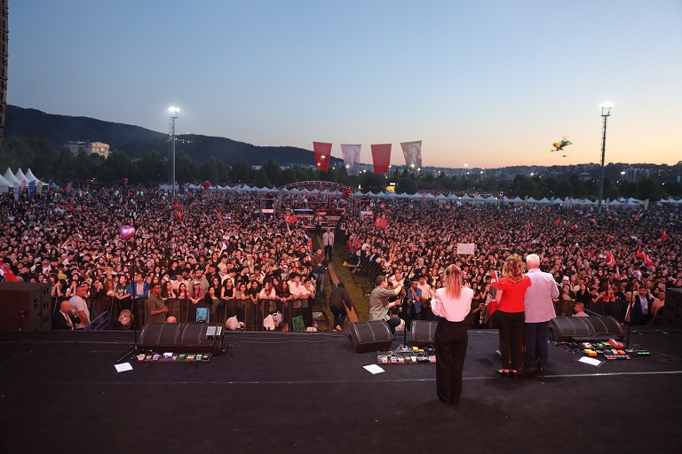 Konuşmanın ardından Başkan Mustafa Bozbey ve eşi Seden Bozbey, ellerindeki Türk bayraklarıyla ‘İzmir Marşı’ eşliğinde gençleri selamladı. Daha sonra Mor ve Ötesi Grubu sahne alarak sevilen eserlerini Bursalılar için seslendirdi. Şarkılara hep bir ağızdan eşlik eden binlerce genç, doyasıya eğlendi. 19 Mayıs Atatürk’ü Anma, Gençlik ve Spor Bayramı’nda Bursa’da olmanın çok güzel bir duygu olduğunu söyleyen Mor ve Ötesi Grubu üyesi Harun Tekin, kendilerini davet eden Bursa Büyükşehir Belediyesi’ne teşekkür etti.