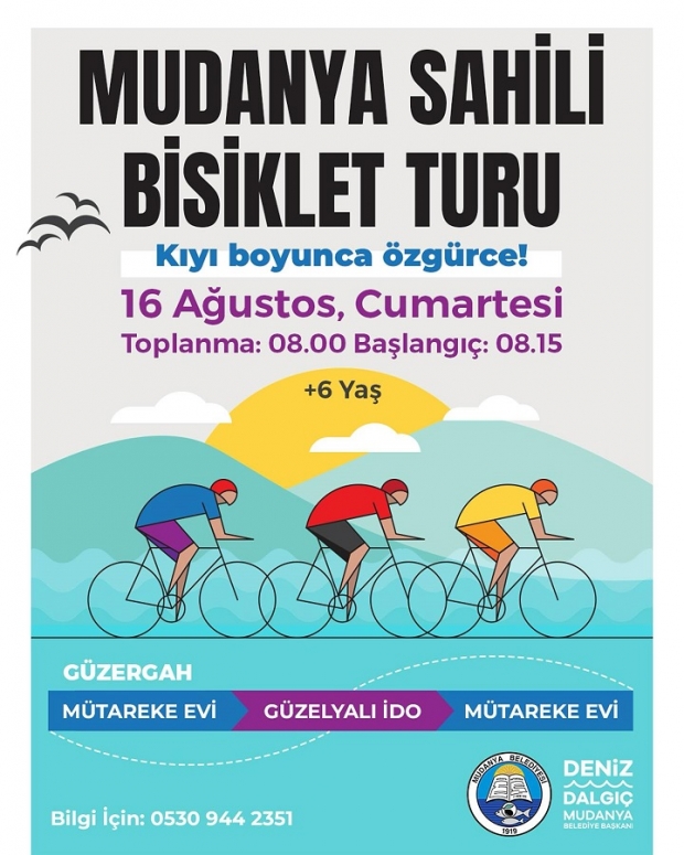 16 Ağustos Cumartesi günü saat 08.00’de Mudanya Belediyespor’un şampiyon bisikletçisi Gökhan Uzuntaş eşliğinde yapılacak bisiklet turunda katılımcılar, Mudanya’nın poyrazında, yaklaşık 10 km boyunca özgürce pedal çevirecek. 6 yaş üzeri herkesin katılımına açık olan ve Mütareke Meydanı’ndan başlayacak turda bisikletçiler Güzelyalı İDO İskelesi’ne varacak. Burada verilecek molanın ardından tekrar Mütareke Meydanı’na gelecek olan bisikletçilere temel sürüş teknikleri, bisiklet kontrolü konularında da bilgilendirmeler yapılacak.