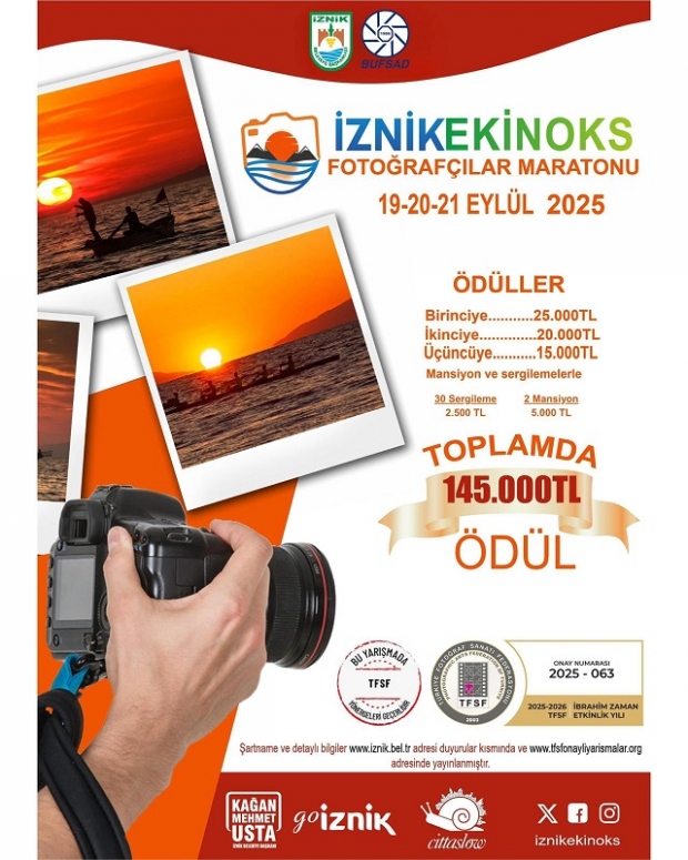 19-20-21 Eylül 2025 tarihlerinde gerçekleşecek olan İznik Belediyesi Ekinoks 2025 Fotoğrafçılar Maratonu yarışma şartnamesi tfsfonayliyarismalar.org adresi ile İznik Belediyesi resmi web sitesi duyurular kısmında ilan edildi.
