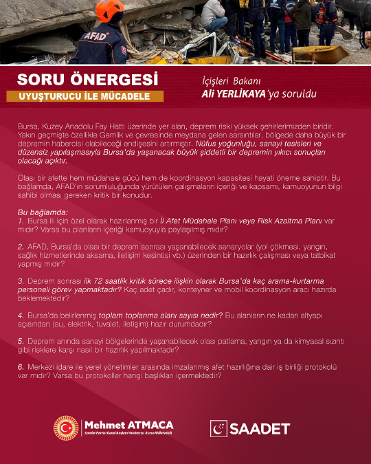 Bursa’da bir afet yaşanması durumunda müdahale kapasitesinin ve koordinasyon yeteneğinin hayati önemde olduğunu belirten Atmaca, bu kapsamda AFAD'ın il özelinde yürüttüğü çalışmalar hakkında kamuoyunun şeffaf biçimde bilgilendirilmesi gerektiğini ifade etti.