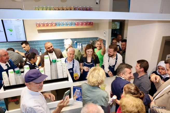 Açılış kurdelesinin kesilmesinin ardından Başkan Mustafa Bozbey ve eşi Seden Bozbey, protokol üyeleri ile birlikte barista önlüklerini giyerek vatandaşlara kahve ikramında bulundu.