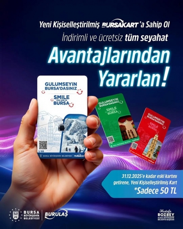 Güvenli altyapıya sahip, mobil uyumlu, dijital altyapıya tam entegre, daha yüksek yükleme limitli, birden fazla işlemi tek kartla yapma kolaylığı sağlayan üçüncü nesil kartlar, ulaşımda Bursalılara hız, kolaylık ve avantaj sağlayacak. 150 TL olan yeni kart bedeli yerine 50 TL’ye yeni nesil kartlarını alabilecek olan vatandaşlar, kart çeşitliliğin azalmasıyla daha sade ve anlaşılır hale gelen sistemi kullanacak. Tüm işlemler tek kartta birleşirken, güvenli ve çağın gereklerine uygun kart teknolojisi kullanıma sunulacak.