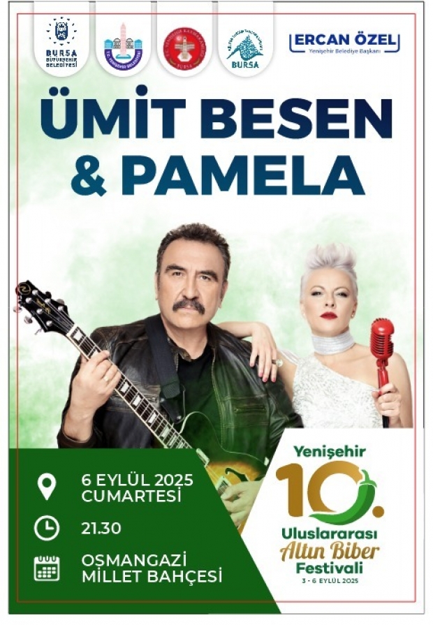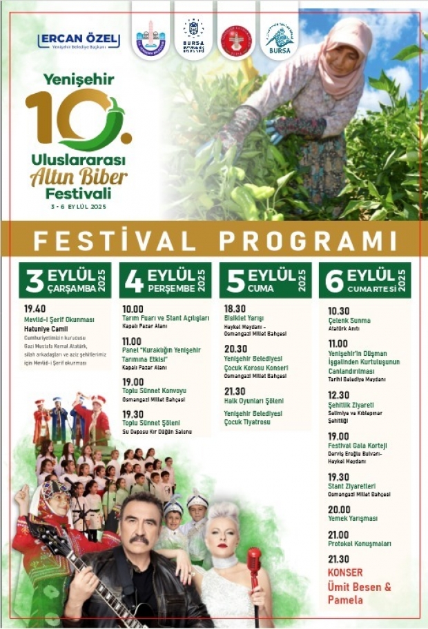 Festival kapsamında; tarım fuarı ve yöresel ürün tanıtımları, spor müsabakaları ve çocuk etkinlikleri, yöresel lezzet yarışmaları, konserler ve sahne gösterileri yer alacak. Festivalin final gecesinde ise Türk müziğinin usta ismi Ümit Besen ve güçlü sahnesiyle Pamela, Yenişehir halkına unutulmaz bir müzik şöleni yaşatacak.