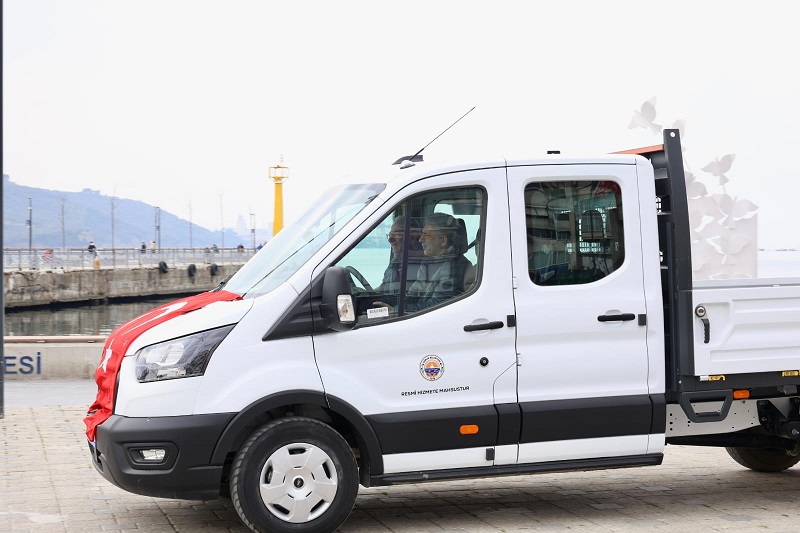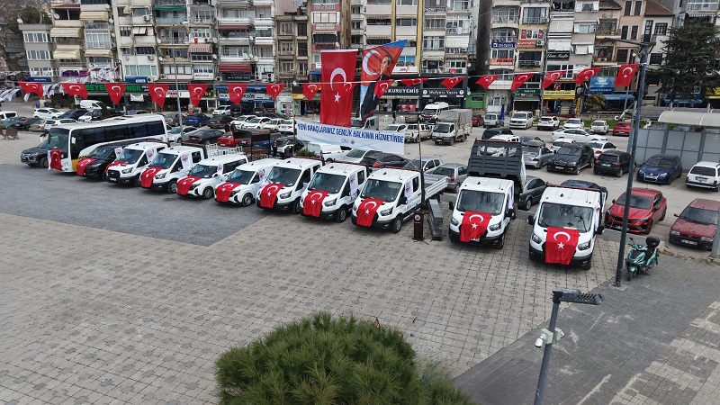 Yeni hizmet araçları, Gemliklilerin incelemesi için İskele Meydanı'nda sergilendi. Filoda kamyonet, minibüs ve arazi araçları bulunuyor.