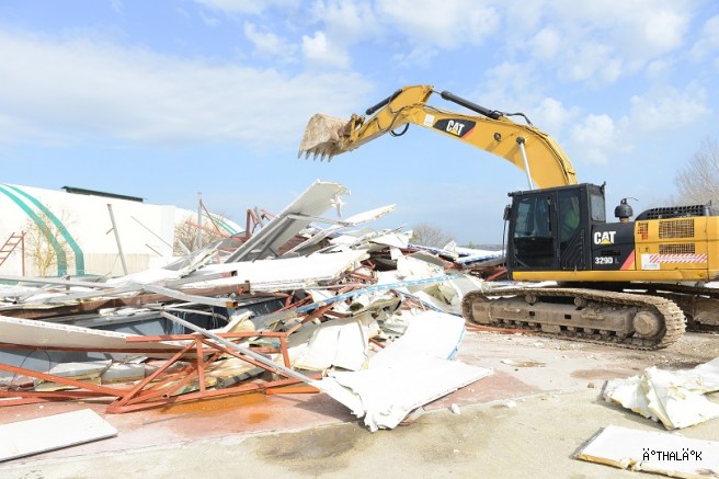 Yıkım programına alınan ilk yer, fabrika olarak kullanılan 600 metrekarelik bir yapı oldu. Yıkım öncesinde, işletme sahibinin mağduriyet yaşamaması adına içeride bulunan makine ve üretim ekipmanları titizlikle tahliye edildi. Malzemelerin zarar görmemesi için alınan önlemlerin ardından iş makineleri devreye girdi ve yapının yıkımı gerçekleştirildi.