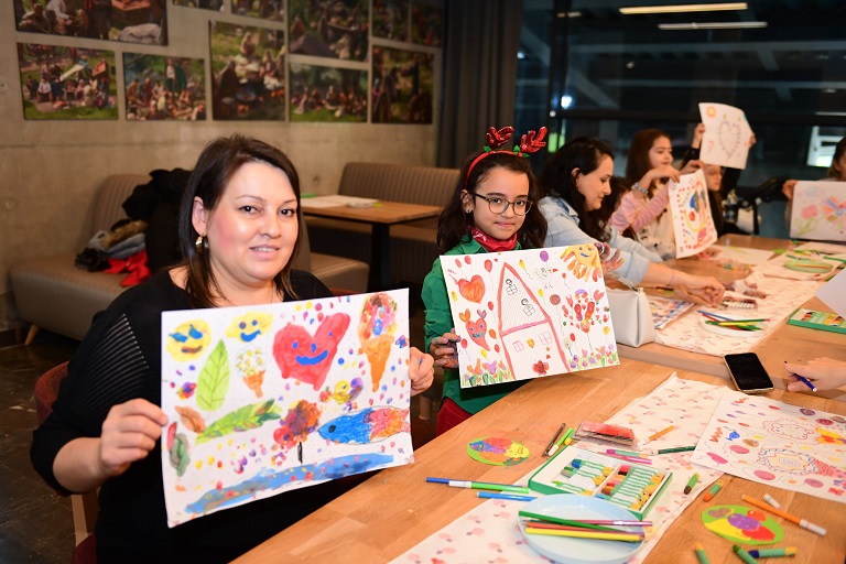 “Bu atölyemizde anneler ve çocukların dünyayı birbirlerinin gözünden nasıl algıladıklarını sanat yoluyla keşfetmelerini amaçlıyoruz. Serbest resim çalışmasıyla ortak bir üretim süreci oluşturuyoruz.