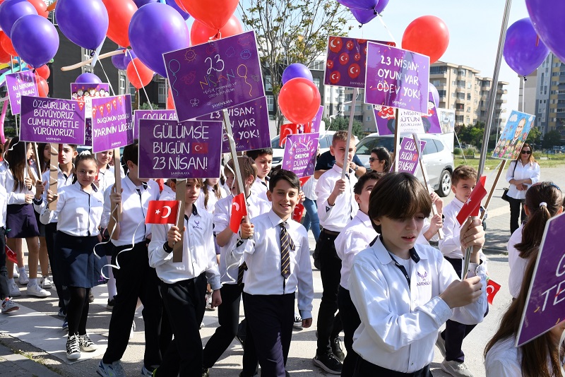 Ulu Önder Mustafa Kemal Atatürk’ün dünya çocuklarına armağan ettiği 23 Nisan Ulusal Egemenlik ve Çocuk Bayramı dolayısıyla Şahinkayalı öğrenciler görkemli bir tören gerçekleştirdiler. Merkez kampüsten başlayan kortejde ellerinde Türk bayraklarıyla mutluluk içinde yürüyen öğrenciler caddeleri marşlarla inlettiler. Kortejin başını çeken Academy Bando Takımının dikkat çeken performansına eşlik eden öğrencilere semt sakinleri de balkonlardan ve dükkanlardan katılarak coşkuya ortak oldular.